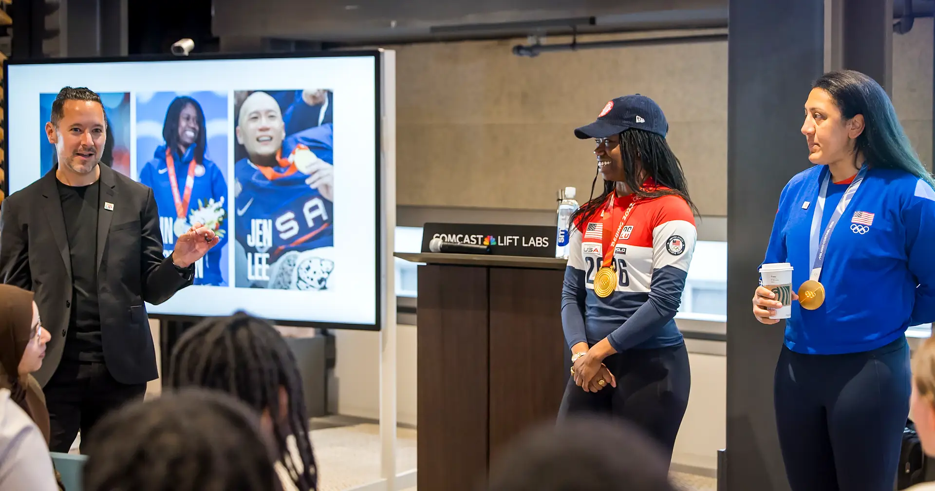 What made this experience truly unforgettable was who showed up alongside them. Olympic gold medalists Erin Jackson and Elana Meyers Taylor and Paralympic gold medalist Jen Lee joined the day as panelists, sharing how they navigated setbacks, built discipline, and turned their journeys into gold. Dalila Wilson-Scott, Chief Impact and Inclusion Officer at Comcast and President of the Comcast NBCUniversal Foundation, moderated the conversation. The day closed with a campus tour of the Comcast Technology Center.